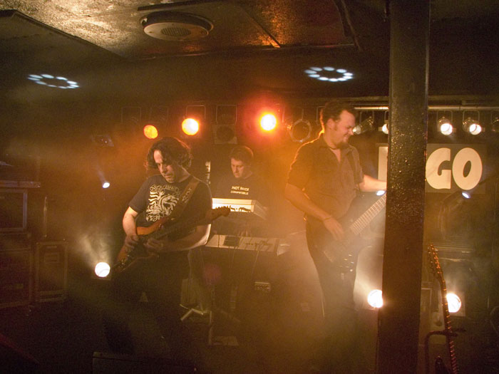 im Laufe des Konzerts aber bessert (oder die Ohren des Rezensenten haben sich einfach daran gewöhnt…). Die Hamburger konzentrieren sich erstmal auf die beiden neusten Alben und bringen auch Stücke vom düster-melancholischen Konzeptalbum „Posthumous Silence“ – erstaunlich, wie diese introvertierten Stücke live funktionieren: Bei den „spoken word“ Passagen vom Band kommt richtig Gänsehautstimmung auf. Gutes Stichwort! Guido Bungenstock legt ein paar leidenschaftliche Soli hin, daß es einem wohlig den Rücken rauf und runter läuft: Das ist leidenschaftliche Musik zum Mitfühlen und –erleben!