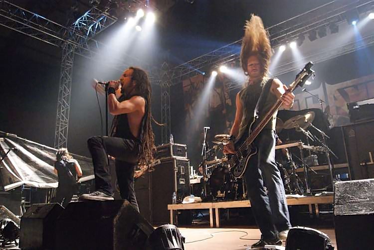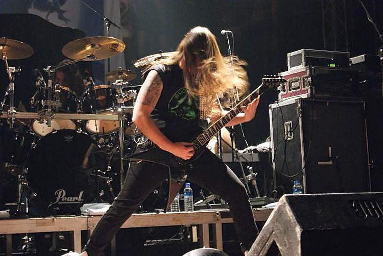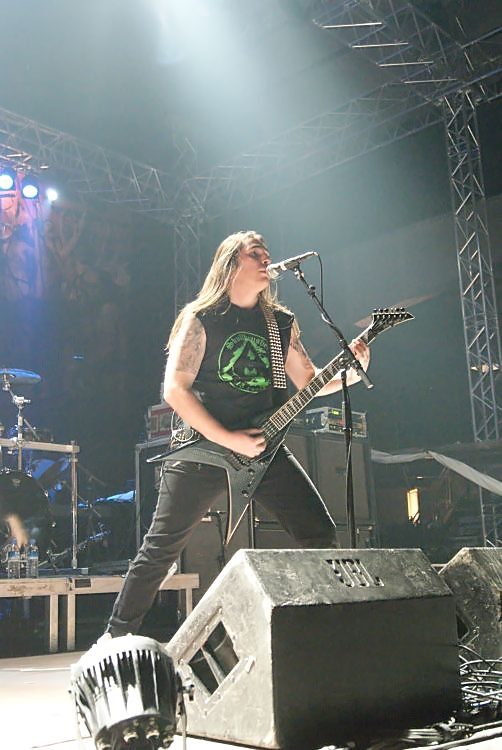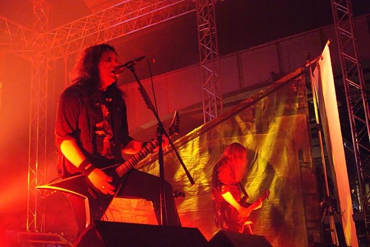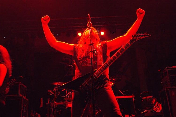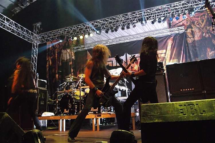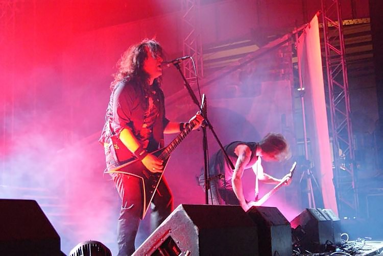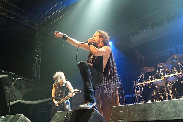 Suicidal AngelsSoweit zu den Rahmenbedingungen, kommen wir zum musikalischen Teil. Der bot wesentlich weniger Anlass zur Klage und das von Anfang an. Natürlich sind die griechischen Oldschool Thrasher SUICIDAL ANGELS alles andere als originell und bedienen sich stilistisch gerne mal im Fundus von SLAYER, SEPULTURA und KREATOR, nichtsdestotrotz sind sie eine spielfreudige und tighte Liveband und stellten das auch an diesem Abend unter Beweis. Man sieht das Publikum bei der ersten Band jedenfalls selten so abgehen, wie an diesem Abend. Acht Songs gaben die auch optisch ganz den 80ern verfallenen Griechen zum besten, das Hauptaugenmerk lag dabei natürlich auf dem aktuellen Album "Dead Again". Hauptsächlich pfeilschnell thrashte man sich durch sein Set, lediglich das etwas langsamere "Beggar Of Scorn" sorgte für eine kurze Verschnaufpause. Der Sound war im vorderen Bereich der Halle brachial laut, ging aber ansonsten in Ordnung. Das Publikum ging jedenfalls jetzt schon ab wie Schmidts berühmte Katze und startete schon mal eine Wall Of Death. Mit ihrem besten Song "Apokathilosis" beendete das Quartett seinen ordentlichen Auftritt.