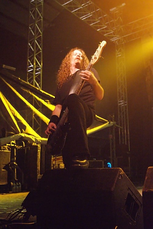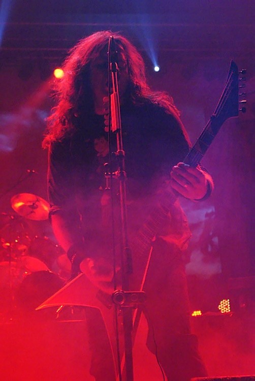 Death AngelDie gute Stimmung ebbte auch bei den Bay Area-Thrashern DEATH ANGEL kaum ab, was alleine schon die Sprechchöre deutlich machten. Für die Show auf der Bühne war in erster Linie Frontmann Mark Oseguada zuständig, der wie von der Tarantel gestochen über die Bretter rannte und sprang und das Publikum anfeuerte, der Rest der Band agierte solide, aber unauffällig. Schade nur, dass seine Gesangsleistung mit zunehmender Spielzeit qualitativ nachlies, was der Partystimmung allerdings keinen Abbruch tat, so waren dann auch die ersten Crowdsurfer über dem Publikum zu sichten. Dem Motto der Tour entsprechend prügelte man sich verhältnismäßig heftig durch die aus zehn Songs bestehende Setlist, die mit "I Chose The Sky" vom neuen Album "Relentless Retribution" eröffnet wurde. In der Folge wechselten sich alte Klassiker und neuere Songs in schöner Regelmäßigkeit ab und mit dem Titeltrack des Debüts "The Ultra-Violence" setzte man den Schlusspunkt unter einen guten, wenn auch nicht unbedingt berauschenden Gig.
