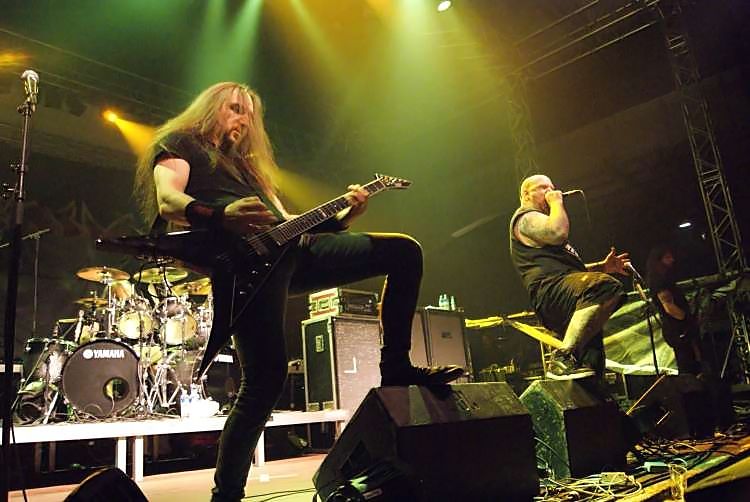ExodusZu den Urgesteinen des amerikanischen Thrash Metals zählen natürlich auch EXODUS, die an diesem Abend ziemlich abräumten. Zum aggressiven Sound ging das Publikum mächtig steil und wurde von Sänger Rob Dukes immer wieder aufgestachelt. Der bullige Frontmann tobte wie ein Kampfhund auf Steroiden über die Bühne und brüllte seine Texte mit entsprechender Mimik heraus, derweil die Gitarristen Lee Altus und Gary Holt stoisch ihre knallharten Riffs zockten. Das war recht beeindruckend und verfehlte seine Wirkung nicht, auch wenn der Rezensent diese Kombination auf Dauer etwas ermüdend fand. Was auch daran liegt, dass das aktuelle Material wie beispielsweise der Opener "The Ballad Of Leonard And Charles" gerne mal unnötig in die Länge gezogen wird, Thrash-Songs gewinnen nach fünf Minuten eher selten noch an Intensität hinzu. Mit "Beyond The Pale" und "Children Of A Worthless God" folgten zudem zwei weitere neuere Songs, bevor mit "A Lesson In Violence" der erste Klassiker ausgepackt wurde, der die Stimmung auch sofort nochmal nach oben trieb. Mit "Blacklist" ging es dann zum "Tempo Of The Damned"-Album, von dem allerdings "War Is My Shepherd" die bessere Wahl gewesen wäre. Sei's drum, denn mit dem Triple bestehend aus dem Übersong "Bonded By Blood", "The Toxic Waltz" und "Strike Of The Beast" ging es zurück zu den alten Tagen, bevor das garstige "Good Riddance" den Schlusspunkt setzte.