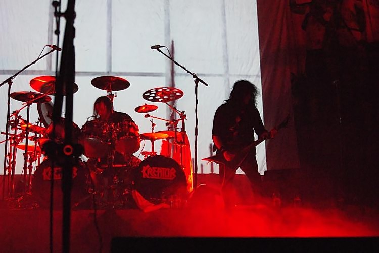 Zu den Klängen von "Personal Jesus" in der Version von JOHNNY CASH bekam man dann zunächst ein Video zu sehen, dass per Camcorder am Nachmittag des Tages gedreht wurde und unter anderem die Bands in den Katakomben und die Aufbauarbeiten zeigte. Nett. Dass die Zuschauer sich zuvor bei EXODUS ein bisschen verausgabt hatten, merkte man beim Auftritt der Headliner KREATOR recht deutlich, denn die Stimmungskurve zeigte langsam abwärts, was sicherlich aber auch am Alkoholpegel und den enstprechenden Ausfallerscheinungen bei manchem Gast lag. KreatorAn der Show der Altenessener kann es jedenfalls nicht gelegen haben, denn die war tadellos. Inzwischen war auch der Sound in der Halle von brutal laut zu laut, aber human gewechselt und besonders der Drumsound war im vorderen Bereich der absolute Wahnsinn. Die Videoshow auf der großen Leinwand war überaus sehenswert und untermalte besonders die Songs "Voices Of The Dead" und "When The Sun Burns Red" eindrücklich. Wo wir gerade bei Songs sind: die ließen jegliche Überraschungen missen, die Setlist bestand zum allergrößten Teil aus den Standards einer KREATOR-Best Of-Show. So ging es nach dem Intro "The Patriarch" natürlich mit "Violent Revolution" los, "Hordes Of Chaos" und "Phobia" folgten. Und so geil Songs wie "Terrible Certainty", "Enemy Of God" oder "People Of The Lie" sicherlich sind, so wäre ein bisschen mehr Abwechslung im Jubiläumsjahr angebracht gewesen. Überraschend war vielleicht noch, dass von "Extreme Aggression" nicht der Titeltrack zum Zuge kam, sondern "Betrayer", das Ende des Hauptblocks markierten "Pleasure To Kill" mit der berühmt-berüchtigten Ansage sowie "Coma Of Souls", der Zugabenblock stand mit "The Pestilence", "Flag Of Hate" und "Tormentor" dann ganz im Zeichen der 80er. Bei dem ganzen Gemecker über die Setlist sollte man aber nicht außer Acht lassen, dass KREATOR auch an diesem Abend spielerisch über jeden Zweifel erhaben waren und neben der Videoshow mit der bekannten Bühnendekoration, einer guten Lichtshow sowie zwei Mikroständern auf der Empore neben dem Schlagzeug, zu denen Mille regemlmäßig hochstieg, auch gut was fürs Auge boten. Insgesamt eine wirklich gute Show, die aber nicht die Intensität des Mördergigs auf dem diesjährigen Rock Hard Festival erreichte.