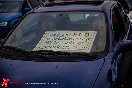 Am heutigen Abend jedoch ist vieles anders - vorbei die Zeiten, als man im Publikum dichtgedrängt stehen und feiern konnte. Die Kolonne der Autos steht im Halbkreis um die Bühne, die leichte Lockerung der Hygienevorschriften erlaubt glücklicherweise, dass die Besatzungen der jeweiligen Vehikel immerhin vor oder neben ihren Auto stehen können. Wie schon bei Mr. Hurley und Mr. Irish Bastard gibt es zur Freude der Fans einen Merch-Stand, der sich zunächst im Schritttempo durch die Reihen bewegt, im weiteren Verlauf aber einfach stehenbleibt, denn die extra für die fünf Konzerte umfassende VERSENGOLD Autokino Sommertour 2020 aufgelegten T-Shirts finden reißenden Absatz.