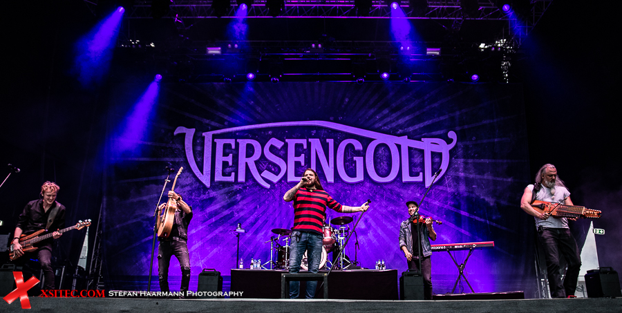 Und es geht Schlag auf Schlag weiter: „Feuergeist“ stellt einem immer noch die Nackenhaare auf, während „Hoch die Krüge“ ein typischer Party-Ohrwurm ist, der auf keinem VERSENGOLD Konzert fehlen darf. Auch das eindringliche „Wir tanzen nicht nach braunen Pfeifen“ sorgt für vielstimmige Chorgesänge im weiten Rund der Arena, bevor mit „Thekenmädchen“ der bisher erfolgreichste Song aus der Feder der Folk-Rocker ansteht. „Butter bei die Fische“ beschließt das reguläre Set, bevor die Bremer mit „Ich und ein Fass voller Wein“ nochmals an die Feierlaune appellieren, „Haut mir kein´ Stein“ als das stärkste Stück aus der Feder VERSENGOLDs rundet das Set ab, danach gibt es noch den obligatorischen „Abgesang“ im á capella-Format.