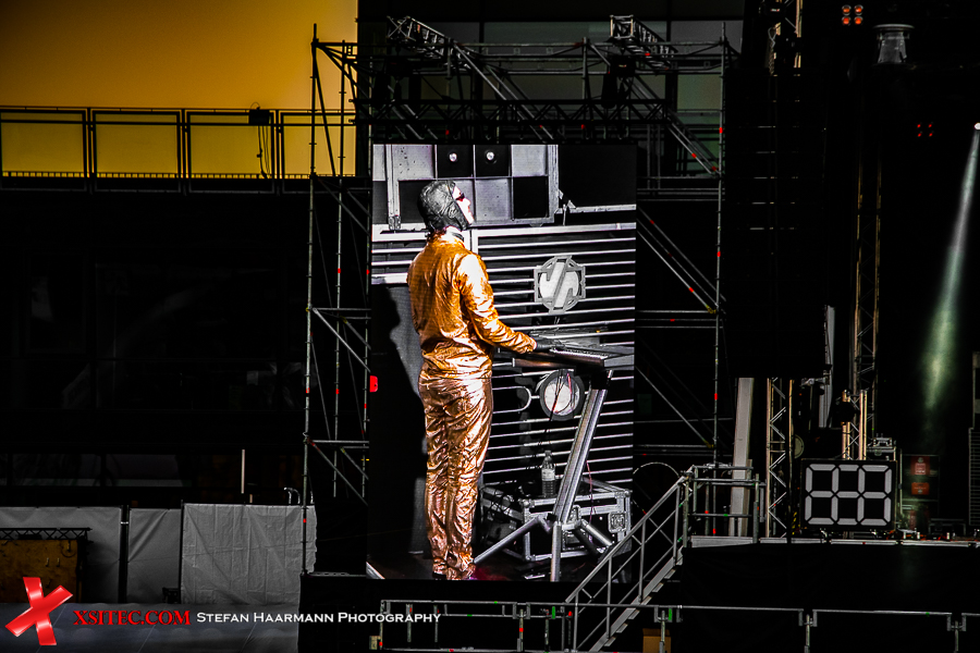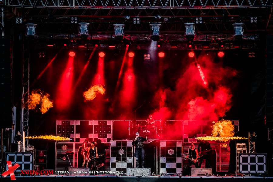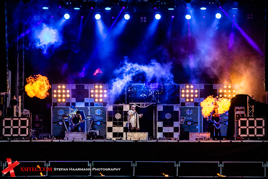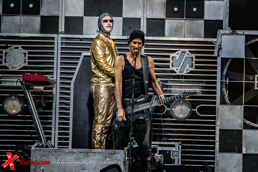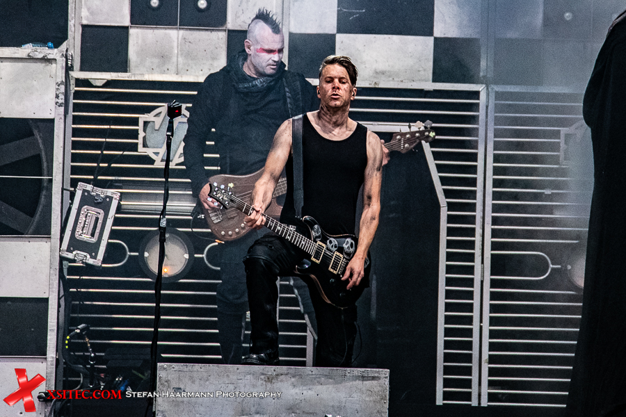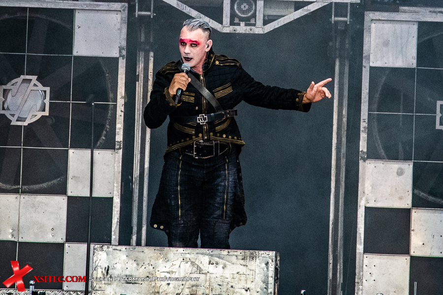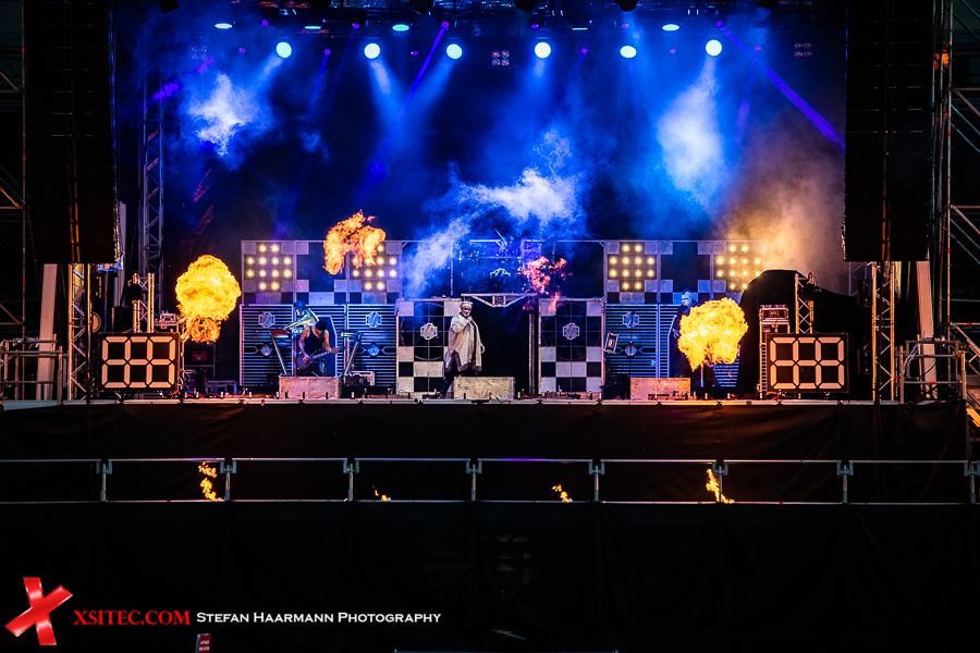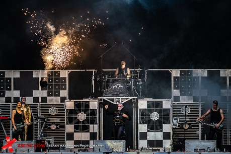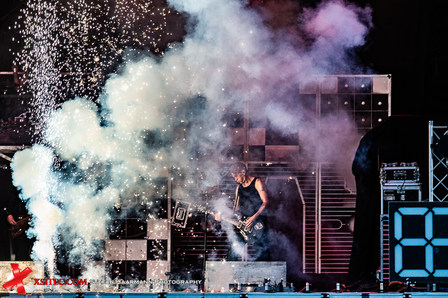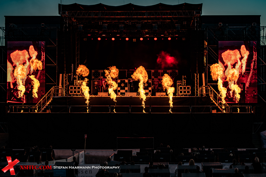 Gestartet wird die Show mit einer brachialen Version des RAMMSTEIN-Klassikers „Rammlied“, in den die Band scheinbar ihre über die vergangenen Monate angestaute Spielfreude hineinlegt. Und während die Band in der Lanxess-Arena durch die Form der Bühne zu reichlich Improvisationen gezwungen war, sorgt die hier im SparkassenPark installierte Großbühne für das gewisse Momentum der Behaglichkeit seitens der Protagonisten, die daher auch wie entfesselt aufspielen. Die ersten Pyros tauchen die Szenerie in ein Meer aus züngelnden, blitzenden Lichtern, was die Zuschauer mit tosendem Applaus quittieren, „Feuer frei“ direkt im Anschluss ist ja schon aufgrund des Titel zu einer Steigerung prädestiniert, was auch in der Umsetzung prächtig gelingt.