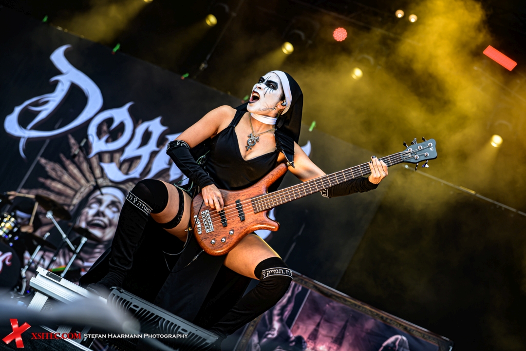 Fünf Frauen, Nonnentracht, Pseudonyme – Lilith, Lamia, Nixe, Rusalka und Abrahel – und ein Sound zwischen Hard Rock und heavy-metallischer NWOBHM-Schattierung. DOGMA pflegen Anonymität als Konzeptkunst, subvertieren offen katholische Symbolik und predigen Anti-Repressions-„Gospel“. Musikalisch ist das eine eingängige, riffstarke Mischung aus Classic-Metal-Rasanz, Hook-Chören und sinistrer Theatralik; das Debüt erscheint über MNRK Heavy und positioniert die Schwesternschaft als „nun-rockers“ der Gegenwart. Auf der Bühne funktioniert das heute brillant: theatralische Gestik, eiserner Groove, viel Call-and-Response – und das ganze Feld singt „Hail!“ auch im Nieselregen. Herkunft? Bewusst verschleiert – die Band kommuniziert sich als anonymes, international besetztes Kollektiv; das passt zum Bildersturm und verhindert Provinz-Schubladen. Genre? Occult/Classic Heavy Metal mit Pop-Attitüde.