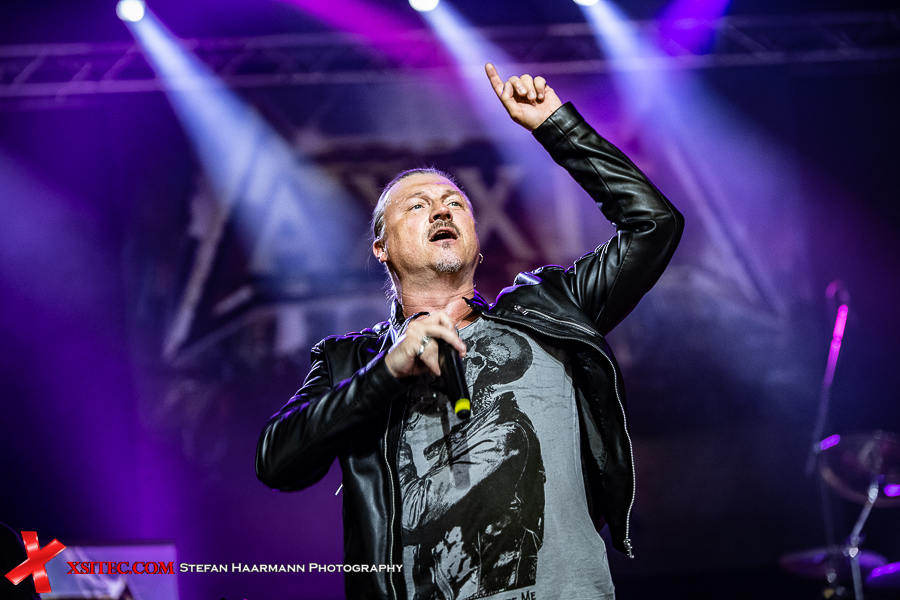 Nachdem Drummer Dirk Brand am Schlagzeug Platz genommen hat, kann es losgehen und mit „Monster Hero“ wird das Zelt gleich einmal richtig durchgewirbelt. Frontmann Bernhard Weiss ist sofort in seinem Element und zeigt sich auch stimmlich voll auf der Höhe, seine Rolle als Entertainer und Einpeitscher hat er augenscheinlich bereits mit der Muttermilch ausgesogen. Die Laune bei Zuschauern und Band ist prächtig, was bei „Blood Angel“ und „Heaven In Black“ sogar noch deutlich gesteigert wird. AXXIS, AXXIS-Sprechchöre lassen die Band immer wieder hochleben, was den Jungs auf der Bühne sichtlich gefällt.