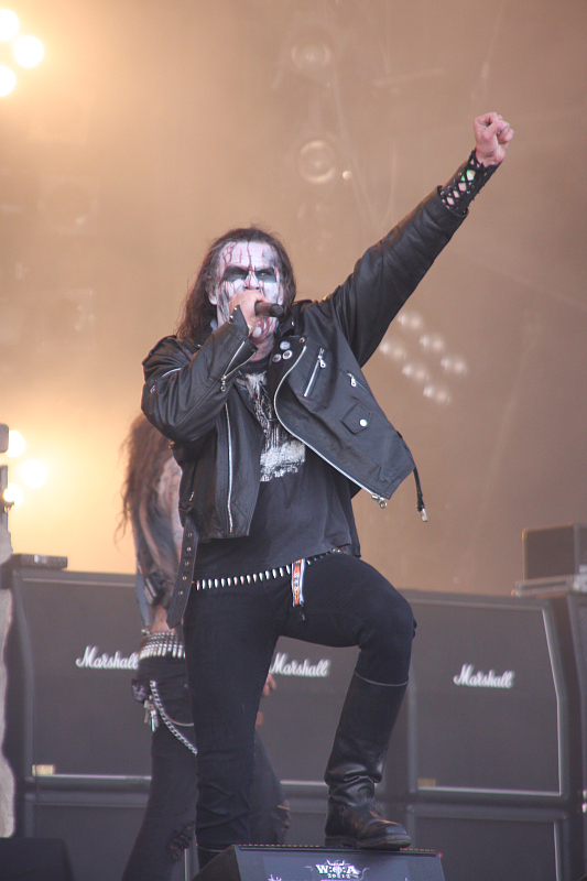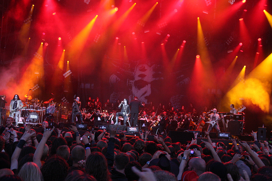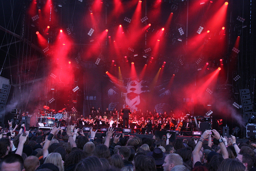 Dimmu BorgirDIMMU BORGIR spielen nicht zum ersten Mal in Wacken, aber zum ersten Mal mit echtem Orchester und großem Chor, wodurch die Bühne natürlich brechend voll ist. Der symphonische Black Metal der Band eignet sich natürlich perfekt für eine solche Umsetzung, bedingt aber, dass der Sound auch wirklich gut abgemischt ist, damit das Ergebnis auch wirklich überzeugen kann. Falls jemand die Aufzeichnung des ZDF gesehen hat und der Meinung ist, dass eben dies nicht der Fall war, dem sei gesagt: vor der Bühne ist der Sound wirklich perfekt und macht den Auftritt zu einem wirklich unvergesslichen Erlebnis. Was wohl auch für die Orchestermusiker gelten dürfte, von denen sich ein paar sogar schwarzmetallisch angemalt haben, wie man auf den großen Videoleinwänden sehen kann. Auch ist der Kontrast zwischen den Bühnenoutfits von Shagrath, Galder und Silenoz und dem klassichen Orchesteroutfit interessant anzusehen. Gespannt durfte man dahingehend sein, welche älteren Songs mit Orchester dargeboten werden. Dass viele Songs vom aktuellen Album "Abrahadabra" gespielt werden würden, ist klar, denn auf diesem Album haben DIMMU BORGIR ja auch mit einem echten Orchester gearbeitet. Und so werden zunächst ausschließlich Songs des leider recht schwach geratenen Albums gespielt. Andererseits muss man aber auch festhalten, dass eben diese Songs in der Livesituation mit Orchester und Chor wesentlich spannender sind, als auf dem Album. Dimmu BorgirDer Auftritt von DJERV-Sängerin Agnete Kjølsrud in "Gateways" wird dank ihrer Ausstrahlung zu einem ersten Highlight. "Dimmu Borgir" wird zunächst nur von Chor und Orchester dargebracht, bevor (unnötigerweise) die Band mit einstimmt. DIMMU BORGIR fahren aber nicht nur musikalisch, sondern auf pyrotechnisch voll auf und so manch ein Orchestermusiker dürfte vielleicht Angst um sein  Holzinstrument gehabt haben. Sieben Songs vom neuen Album werden gespielt, bevor das Programm dann auch endlich um Lieder von den anderen Alben ergänzt wird. "Eradication Instincts Defined" wird sehr stimmungsvoll ohne metallische Unterstützung dargeboten, danach geht die Post mit "Vredesbyrd", dem wahrhaft bombastischen "Progenies Of The Great Apocalypse" und "The Serpentine Offering" ab. Der Übersong "Kings Of The Carnival Creation" darf nicht fehlen, die Industrial-Nummer "Puritania" wirkt allerdings etwas fehl am Platze. Und wie sollte es anders sein, bricht mit den ersten Tönen von "Mourning Palace" ein gigantischer Jubelsturm los. Der spektakuläre Auftritt findet dann in "Perfection Or Vanity" einen ruhigen Ausklang. (ASZ)