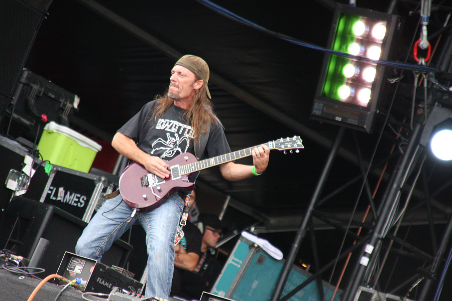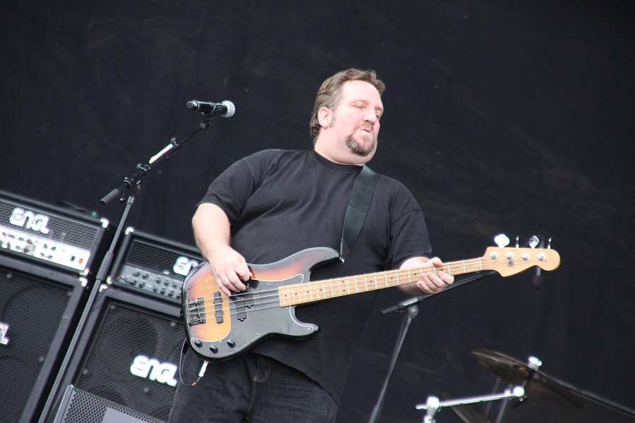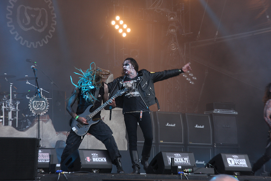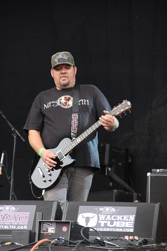 Kurz nach High Noon liegt bereits der typisch unangenehme Geruch vom weichen, plattgetrampelten Festivalboden in Verbindung mit warmer Sonne in der Luft. Dabei sollten die richtigen Belege von oben erst noch kommen... Aber noch ist es nicht so weit und der Weg zur True Metal Stage, wo SACRED REICH wie schon bei ihrem letzten Besuch viel zu früh auf die Bühne müssen, ist noch problemlos zu bewältigen. Es ist dann auch sehr gut gefüllt, als der Vierer aus Phoenix zum "Imperial March" aus Star Wars aufläuft und anschließend mit dem überwiegend instrumentalen "Death Squad" gleich mal voll ins Mett haut. Sacred ReichDas ist wörtlich zu nehmen, denn der Sound ist enorm basslastig und besonders von Drummer Greg Hall spürt man auch in nicht direkter Nähe zur Bühne jeden Schlag und Tritt tief in den Eingeweiden. Dabei hat die fast ausschließlich aus Thrash-Klassikern bestehende Setlist auch so genug Durchschlagskraft, um das Volk in Wallungen und die Köpfe zum Schütteln zu bringen. Ober-Sympathicus Phil Rind, der mit seiner Wohlstandsplautze hinter seinem Bass auch ohne großartige Bewegungen eine Menge und vor allem positive Ausstrahlung mitbringt, bedankt sich wie gewohnt ständig bei den Fans für die guten Reaktionen. Diese kommen seinem Wunsch nach einem Circle Pit bei Nummern wie "Administrative Decisions" und "Ignorance" wiederum gerne nach, wenn auch im Vergleich zu manch anderem Act im eher kleinen Rahmen. Ein kleines Manko bleibt bis zum Ende der Sound, da Greg Hall wirklich viel zutrommelt, während die Gitarren von Wiley Arnett und Jason Rainey insgesamt etwas zu leise sind, und auch die Setlist bietet seit der Wiederbelebung der Band natürlich kaum Überraschungen. Aber welche Songs sollte man davon auch weglassen? "I Don't Know", "The American Way", "Independent" oder das BLACK SABBATH-Cover "War Pigs", die trotz sehr überschaubarer Bewegung und Show auf der Bühne auch heute allesamt voll einschlagen, auf jeden Fall nicht. Auch das ein wenig das Tempo, aber nicht die Stimmung drosselnde "Crimes Against Humanity", das Phil Rind dem zu diesem Zeitpunkt noch inhaftierten LAMB OF GOD-Sänger Randy Blythe widmet, ist ein absolutes Muss und wird standesgemäß mitgeklatscht. Und als es zur Schlussnummer "Surf Nicaragua" in den vorderen Reihen in Sachen Circle Pit dann noch mal so richtig abgeht, lässt das das Grinsen des Frontmanns noch weiter anwachsen. Einmal mehr also ein überzeugender Auftritt der gestandenen Thrash-Metal-Herren, der den anhaltenden Wunsch nach einem neuem SACRED REICH-Album nicht gerade verkleinert hat. (LS)