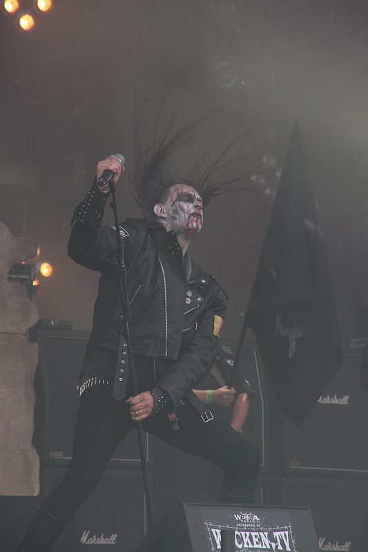 EndstilleNein, so richtig nachvollziehen konnten ENDSTILLE im Vorfeld nicht, warum sie den Freitag auf der Black Stage um 11 Uhr morgens eröffnen müssen. Die Kieler Black-Metal-Fregatte nimmt es aber mit Humor und lädt in Abwandlung ihres Songs "Frühlingserwachen" zum "Frühstückserwachen". Schade nur, dass es ihnen nicht möglich ist, wie geplant Kaffee an die Fans in der ersten Reihe zu verteilen. Zum Vertreiben des Katers kommt ihr Sound aber gerade recht, was auch zahlreiche Fans so sehen und so ist es schon ziemlich voll vor der Bühne, als die Jungs mit "Dominanz" in ihr einstündiges Set starten. Eine ausgebombte Ruine ziert die Bühne, auf der sich besonders Sänger Zingultus, Basser Cruor und Neugitarrist B.Killed viel bewegen, wie üblich feuert Wachtfels seine Riffs mit stoischer Gelassenheit in die Menge. Inzwischen wirken auch die Bewegungsabläufe von Zingultus absolut souverän, das leicht tolpatschig wirkende Gestampfe seiner Anfangszeit bei ENDSTILLE gehört der Vergangenheit an und er hat sich offenbar gut an die großen Bühnen gewöhnt. Weiter geht es im Set mit "Endstilles Reich" und "Satanarchie", zu dem mit Gasmaske bekleidete Fahnenträger auf die Bühne kommen, was schön martialisch wirkt. Im Laufe des Sets wird zum Glück auch der Sound immer besser, anfangs sind die Gitarren nämlich noch viel zu leise. "When Kathaaria Falls", "World Aflame" und "Frühlingserwachen" kommen weiterhin zum Zuge, bevor es mit "Anomie" und dem Klassiker "Navigator" langsam schon aufs Ende eines – wie immer – guten Auftritts zugeht. (ASZ)