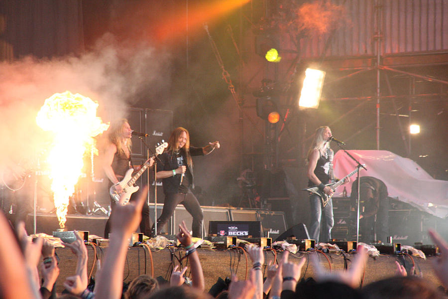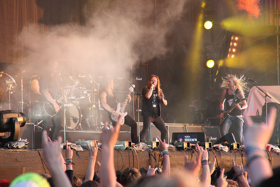 Als nächster Programmpunkt steht ein Interview mit der doch sehr hübschen Sängerin von KOBRA AND THE LOTUS auf dem Plan, weshalb es leider nicht mehr reicht, um OPETH auf der Black Stage zu sehen. Stattdessen steht zunächst die Suche nach einem guten Platz, um DIMMU BORGIR zu sehen, an, immerhin möchte man ja nicht unbedingt mitten in einer der riesigen Pfützen stehen. Als der Platz gefunden ist, stellt man fest, dass man ja auch noch einen guten Blick auf die True Metal Stage hat, auf der HammerfallHAMMERFALL gerade ihr Werk verrichten. Hören tut man eh gut, da der Sound immer auch über die Boxen der Nebenbühne geleitet wird. Und etwas überraschend liefern die Schweden einen richtig guten Gig ab, an dem es so gut wie nichts auszusetzen gibt. Der Sound ist prima, die instrumentale Darbietung ziemlich tight und Frontmann Joacim Cans ist verdammt gut bei Stimme. Kein Wunder, dass die Stimmung hervorragend und ausgelassen ist und selbst vor der Black Stage stehen zahllose Fans und schütteln ihre Haare. HAMMERFALL zelebrieren nach eigener Aussage ihr 15-jähriges Wacken-Jubiläum und servieren dazu eine gelungene Setlist mit zahlreichen Hits wie "Heeding The Call", "Blood Bound", "Steel Meets Steel", "Renegade", "The Dragon Lies Bleeding", "Let The Hammer Fall" und "Hearts On Fire". Beide Daumen hoch für diese Performance, mit der HAMMERFALL ein bisschen die Überraschungssieger des diesjährigen Wacken Open Airs sind. Stark! (ASZ)