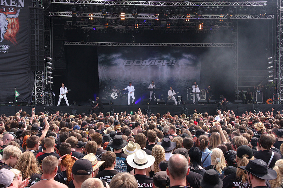 Oomph!Die erfolgreichsten Zeiten von OOMPH! liegen inzwischen zwar schon ein paar Jahre zurück, aber trotzdem zieht die Band am frühen Nachmittag immer noch jede Menge Volk vor die Party Stage, das den Auftritt der Wolfsburger Electro-Rocker auch gehörig abfeiert. Einheitlich in ein Matrosenoutfit gewandet, erscheint man in Sieben-Mann-Stärke auf der Bühne, wobei man sich schon fragen darf, warum man gleich zwei Keyboarder braucht. Sänger Dero ist im Gesicht zudem wie der Joker aus Batman geschminkt, dürfte aber auch ohne diese Maskerade das Grinsen angesichts der Publikumsreaktionen nicht aus dem Gesicht bekommen. Musikalisch bieten die Herrschaften ein gelungenes Best-Of-Programm, bei dem die Hits "Labyrinth", "Gott ist ein Popstar" und "Augen auf" natürlich nicht fehlen dürfen. Besonders gut kommt "Träumst du" an, bei dem die Menge hüpft, während "Bis der Spiegel zerbricht" Teeniestar Justin Bieber gewidmet wird. 80er-Fans erfreuen sich am eingedeutschen Cover von BRONSKI BEATs "Smalltown Boy", was natürlich "Kleinstadtboy" heißt und wer schon lange Fan der Band ist, bekommt "Mitten ins Herz" aus dem Jahre 1995 kredenzt. Den Rest des Auftritts verfolgen wir dann aber nur noch mit einem Ohr, da die Merchandise- und Futterstände rund um die Party Stage noch nicht begutachtet sind. Und mit Trauer müssen wir festhalten, dass der Stand, an dem es letztes Jahr großartige Hausmannskost zu fairen Kursen gab, in diesem Jahr nicht dabei ist. Dafür gibt die Grabbelkiste vom Artworx-Stand einiges her, unter anderem drei KAMELOT-Shirts in Größe L für läppische 5,- € - eines davon muss natürlich verhaftet werden. (ASZ)