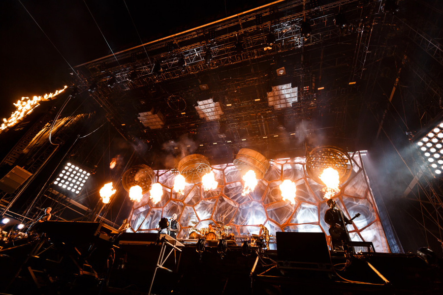RAMMSTEIN will jeder sehen. Und so ist es zum Auftritt des Donnerstagsheadliners nicht nur vor der True Metal Stage brechend voll, sondern auch im VIP-Bereich tummeln sich mehr Leute als sonst. Darunter auch norddeutsche Prominente wie Nasal-Sänger Jan Delay oder Schauspielerin Eva Hassmann, die Ex-Frau von Comedian Otto Walkes. Was die mit dem Wacken Open Air zu tun haben? Naja, Hauptsache man kann hinterher auf Facebook erzählen, dass man mal da gewesen ist. Andererseits sind RAMMSTEIN ja auch eine Mainstream-Band (geworden), insofern verwundert szenefremdes Publikum nicht wirklich. Die Megaseller haben für die imposanten Bühnenaufbauten die True Metal Stage den ganzen Tag in Beschlag genommen, dementsprechend groß ist die Spannung im Publikum kurz vor Beginn des Auftritts. Und als der Vorhang dann fällt, wird der Blick auf einen düsteren Bühnenhintergrund freigegeben, der wie organisches Zellgewebe aussieht. Links und rechts sorgen 36 Scheinwerfer für Beleuchtung, von oben kommen riesige kreisrunde Beleuchtungsträger, um die Show ins rechte Licht zu rücken. Im Grunde genommen weiß man ja, was einen erwartet, wenn man RAMMSTEIN aber zuvor noch nicht live gesehen hat, ist die Show einfach der helle Wahnsinn und man steht mit offenem Mund da und betrachtet das feurige Treiben von Till Lindemann und seinen Gesellen. Der bullige Frontmann kommt zum Opener "Ich tu dir weh" in einer rosafarbenen Felljacke auf die Bühne herabgeschwebt, auf der Drummer Christoph Schneider und der irre Keyboarder Flake erhöht positioniert sind, die beiden Gitarristen und der in eine finstere Kutte gehüllte Basser Oliver Riedel wechseln die Positionen zwischen unterer und oberer Bühnenebene permanent. Und was dann in den nächsten 105 Minuten passiert, ist kaum in Worte zu fassen. Ständig steigen Flammen in den Himmel auf, die Lichtshow ist atemberaubend, die Mimik und Gestik von Sänger Till Lindemann gleicht der eines Wahnsinnigen, das Gehampel von Flake wirkt kaum weniger irre.
