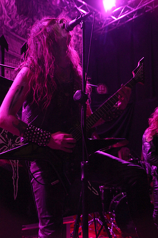 So haben es DEGIAL zunächst auch schwer, die Menge auf Betriebstemperatur zu bringen, was jedoch nicht nur an derer leichten Lethargie liegt, sondern auch am Sound, den die vier Schweden fabrizieren. Räudiger Death Metal der alten Schule, der jedoch keineswegs eingängig stumpf, sondern recht komplex und dadurch schwerer nachvollziehbar ist, wenn man die Songs nicht kennt, ist eben auch keine Musik, zu der man auf Anhieb abgehen kann. DEGIAL positionieren sich irgendwo zwischen ganz frühen DISMEMBER und MORBID ANGEL und versehen ihre Interpretation mit einer schwarzmetallischen Kante, die sparsam eingesetzten Harmonien haben DISSECTION-Flair, was ein stimmiges Package mit WATAIN ergibt. Die Songs des Debütalbums "Death's Striking Wings" werden von DEGIAL mit recht beeindruckender Sicherheit dargeboten und auch die vielen Rhtyhmus- und Tempowechsel bringen die Band nicht aus dem Konzept. Das besteht im übrigen darin, auf Kommunikation mit dem Publikum zu verzichten und die Songs ohne größere Unterbrechung herunterzuholzen. Dementsprechend unaufgeregt ist auch die Bühnenshow, es gibt keinerlei überflüssiges Gehampel und Gepose, sondern mit den Haaren im getünchten Gesicht wird in sich gekehrt gebangt, wo es gerade passt, ansonsten beschränkt sich die nahezu komplett in Leder gekleidete Band auf eine solide musikalische Darbietung.