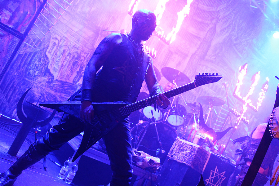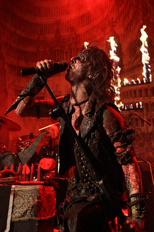 Im Vordergrund stehen die ebenfalls bekannten umgedrehten Kreuze mit Tierschädeln, auf der Bühne verteilt liegen viele Knochen und direkt vor dem Schlagzeug steht der kleine Altar, an dem Erik im Verlauf des Konzertes immer wieder rituelle Handlungen vornimmt. Verrottende Tierkadaver macht man keine aus und auch wenn die Band in ihren zerlumpten Bühnenoutfits immer ein bisschen modrig riecht, hält sich die Geruchsbelästigung in engen Grenzen. Unter großem Jubel und zu den eröffnenden Klängen von "Night Vision" kommt Erik mit brennenden Holzstäben auf die Bühne, um die beiden Dreizacke in Flammen zu setzen. Das will beim Linken nicht so recht funktionieren, was den Sänger sichtlich frustriert und wütend schleudert er die Holzstäbe von sich - im Fotograben muss man kurz in Deckung gehen. Das kleine technische Problem ist aber schnell behoben und so züngeln dann wenig später auf beiden Seiten die Flammen nach oben. In blutrotes Licht getaucht, geht es mit dem rasenden "De Profundis" weiter und Erik zieht schnell alle Register. Er windet sich wie eine Schlange um den Mikrofonständer, zuckt wie besessen und lässt sich von unten anstrahlen, um seinem Gesicht eine dämonische Wirkung zu verleihen. Man merkt dem Frontmann zu jeder Sekunde an, dass er seine Musik mit jeder Faser seines Körpers lebt, davon wiederum lebt auch ein WATAIN-Konzert.