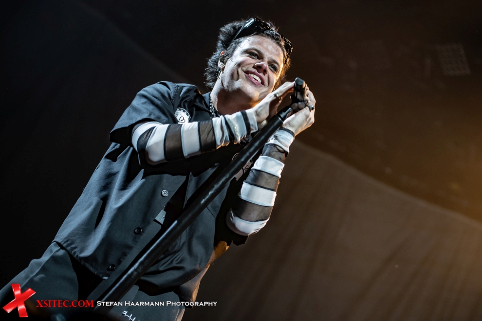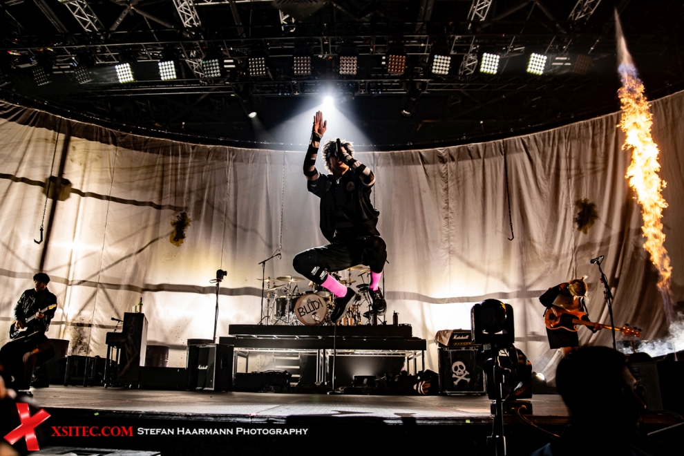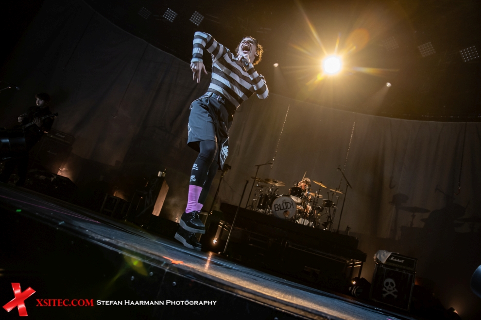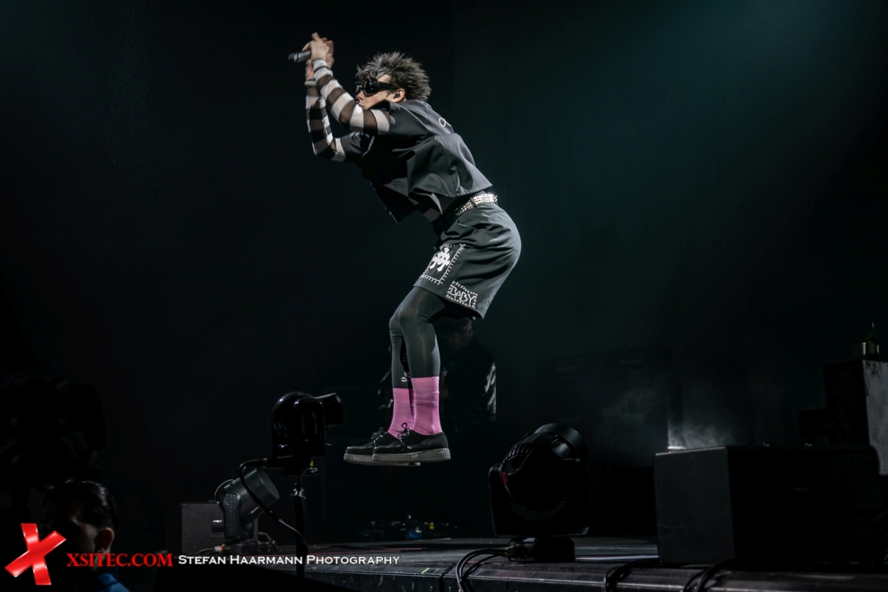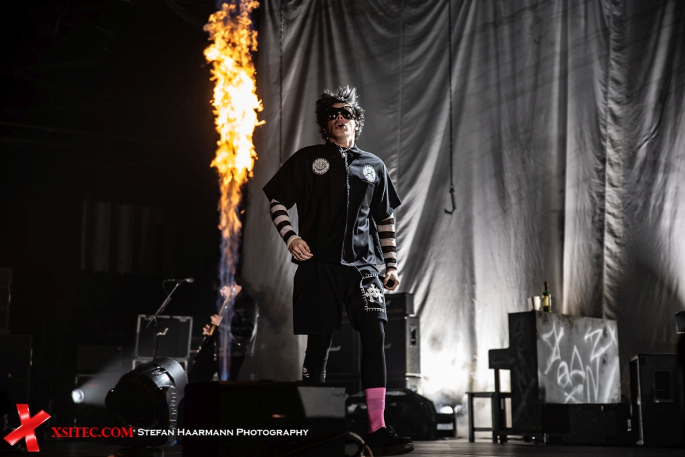 Zum Glück verspricht die nachfolgende Show etwas mehr Action und diejenigen, die sich schon in der Umbaupause mit „YUNGBLUD“-Sprechchören warmgemacht haben, sollten hier auch nicht enttäuscht werden. Los geht es mit „21st Century Liability“ und Dauerfeuer der entlang der Bühne verteilten Flammenwerfer, die für eine zusätzliche Requisite des Hauptakteurs in Form einer Schweißerbrille sorgen. Das macht bereits optisch eine Menge her, der Sound ist zudem glasklar und trotz der permanenten Sprungeinlagen bleibt der Gesang perfekt und voluminös. Chapeau!